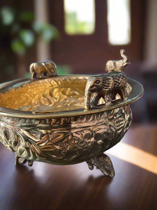 Brass Urli with Elephant Motifs – Traditional Decorative Centerpiece